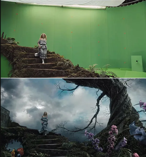 Figura 1 & 2. Imagem do filme Alice no País das Maravilhas (2010) [Captura de tela do filme]. Davidson, S. (13 de agosto de 2017). Em Filmagem e composição com tela verde. Medium. Em cima a imagem captada com verde de fundo e depois a imagem composta com cenário virtual feito em pós-produção. No plano em ca atriz anda numa escada real construído em estúdio. Em pós-produção foi colocado o céu, as flores em primeiro plano para dar a sensação de profundidade e tridimensionalidade à imagem.