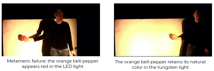 O metamerismo é um outro problema a abordar, tanto que David Stump durante a conferência de Estugarda, aconselhou aos diretores de fotografia a evitar que utilizem como luz principal nos atores, a luz vinda dos painéis do LED Wall. A razão com o fenómeno espectral denominado metamerismo. Esta situação ocorre quando duas fontes de luz parecem ser iguais em termos de temperatura de cor e de tonalidade, mas não possuem a mesma onda do espectro e a tonalidade da luz que incide sobre o objeto difere muito. Apesar do mesmo tom cromático a resposta não é mesma e isso é causado pelo facto dos fabricantes de LEDs não separarem as cores individualmente nas três cores primária RGB. Em vez de haver a separação individual das cores emitidas pelo LED o fabricante opta por fazer a mistura de cores para atingir determinada temperatura de cor, mas causa um defeito na natureza dessa fonte de luz que ao incidir sobre um objeto de uma determinada tonalidade causa uma reflexão distorcida.