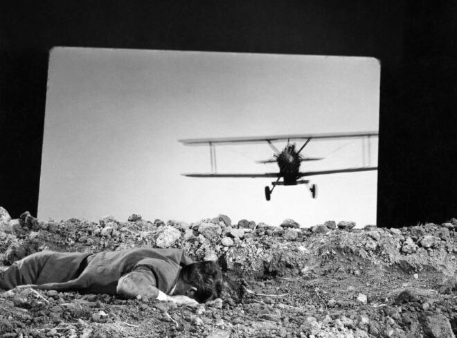 Figure 6. a filmagem com uso da técnica de retroprojeção em que o ator Cary Grant se baixa à passagem da avioneta que o persegue em voo rasante. Figura retirada do site: https://neiloseman.com/the-history-of-virtual-production