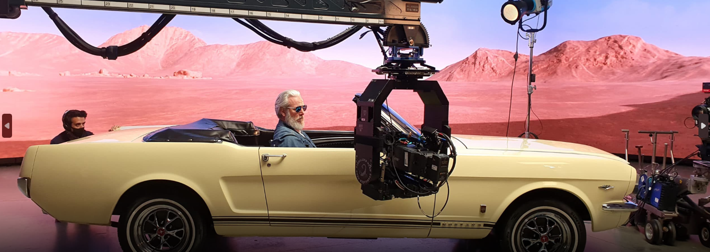 Imagem da série da Netflix que combina green screen com LED walls. Não usando os ecrãs wall para combinar com imagem real, mas usá-la para reflexos de luz sobre o veículo e os atores, criando assim maior realismo. Estes efeitos não são possíveis com a técnica do green screen.