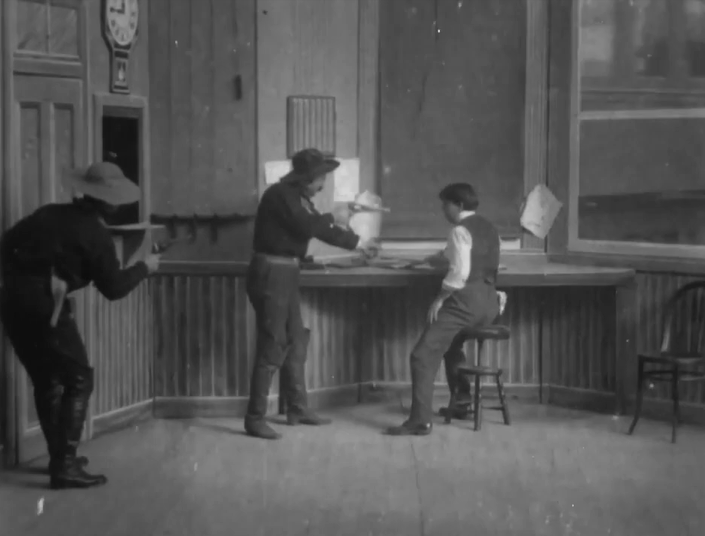 Figure 4 & 5 . Film still from The Great Train Robbery (1903) [Film still]. Porter, E. S. (Director). The Great Train Robbery. Frames do filme. Na zona da janela passa um comboio na verdade é um truque fotográfico como explicado no texto sobre dupla exposição. Na segunda imagem é a porta do vagão do comboio aberta que se encontra no lado direito, usando a mesma técnica. For access to the film, see link. https://vimeo.com/950345008