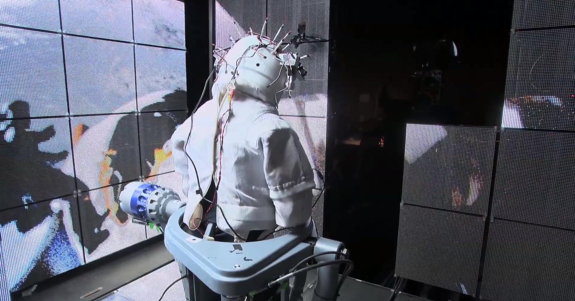 Atriz Sandra Bullock dentro da caixa de luz idealizada pelo DF Emmanuel Lubezki. Pode-se perfeitamente observar os pixels nos ecrãs como até o efeito moiré. Estes painéis LED estavam longe de ser adequados para estúdio virtual como hoje conhecemos dada a distância entre os pontos luminosos emitidos pelos pixels.