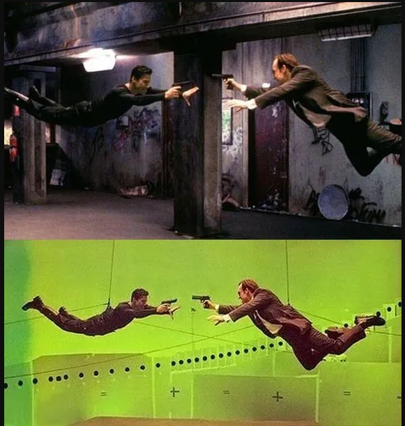 Figure 3 & 4. Imagem do filme Matrix (1999) [Film still]. Davidson, S. (2017, August 13). In Green screen filming and compositing. Medium. Os dois atores fazem a sua atuação pendurada em cabos e o fundo está revestido de verde que será substituído pela imagem como está representado em cima.
