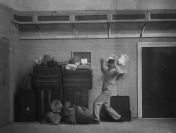 Figure 4 & 5 . Film still from The Great Train Robbery (1903) [Film still]. Porter, E. S. (Director). The Great Train Robbery. Frames do filme. Na zona da janela passa um comboio na verdade é um truque fotográfico como explicado no texto sobre dupla exposição. Na segunda imagem é a porta do vagão do comboio aberta que se encontra no lado direito, usando a mesma técnica. For access to the film, see link. https://vimeo.com/950345008